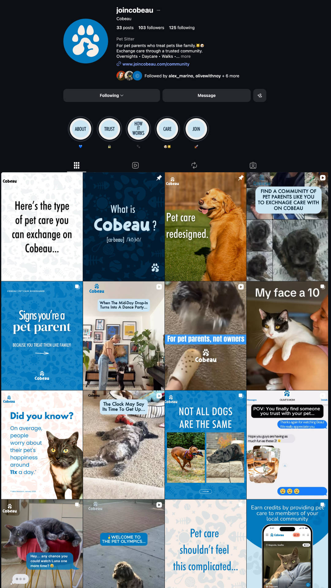 Led social strategy and launch execution, building Cobeau’s presence from the ground up across Instagram and TikTok. I translated a new, community-based pet care model into content that felt both clear and emotionally resonant—developing the brand voice, creating original video assets, and shaping a narrative that supported early traction and connection ahead of launch.